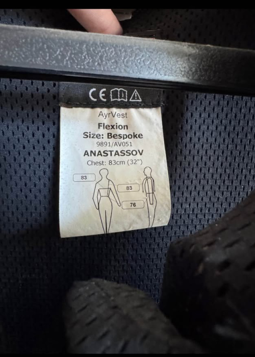 Seller's Description: AiroWear integrated body protector and air vest, by Charles Owen Ayrvest Safety Rating: M38:FEB2015 and BETA 2009 Level 3 Lovely eventing vest would best fit a rider 5’5 and up Size: Xs (longer length) Great condition, no falls. 60cc cannister Light blue collar and piping. Retail price was $1000 (Does not include cannisters as I can’t ship them)