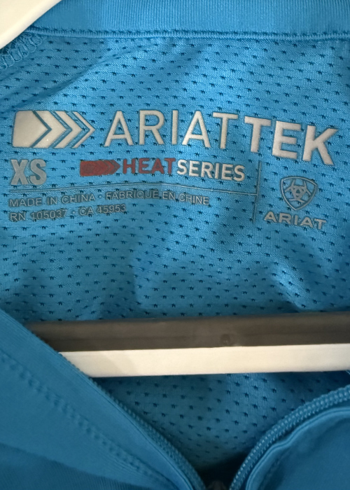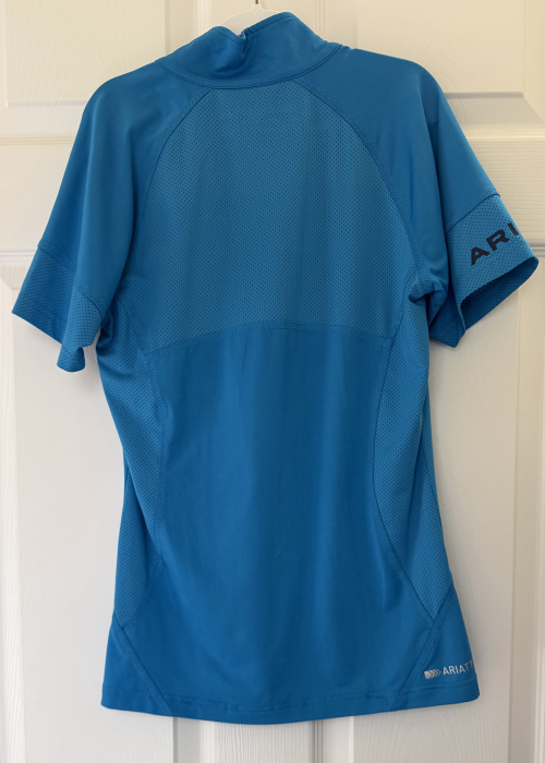 Seller's Description: Ariat tek heat series short sleeved front zip, aqua blue